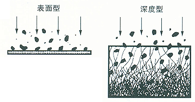 一深度过滤:将颗粒捕捉于滤材深层中,而不只是表面的过滤。此种滤材多由纤维构成,如纤维烧结滤材、树脂烧结滤材。